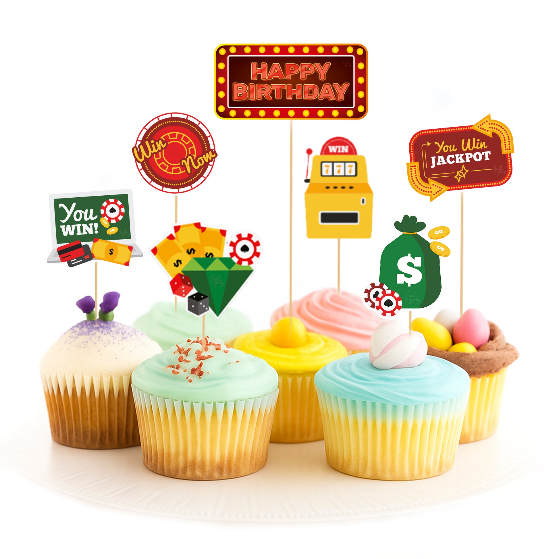 This combo includes a glamorous casino cake topper for your birthday cake and smaller toppers that double as cupcake/muffin toppers or casino photo props. Add them to your desserts for a vibrant casino vibe or let guests use them for stylish, game-inspired pictures.