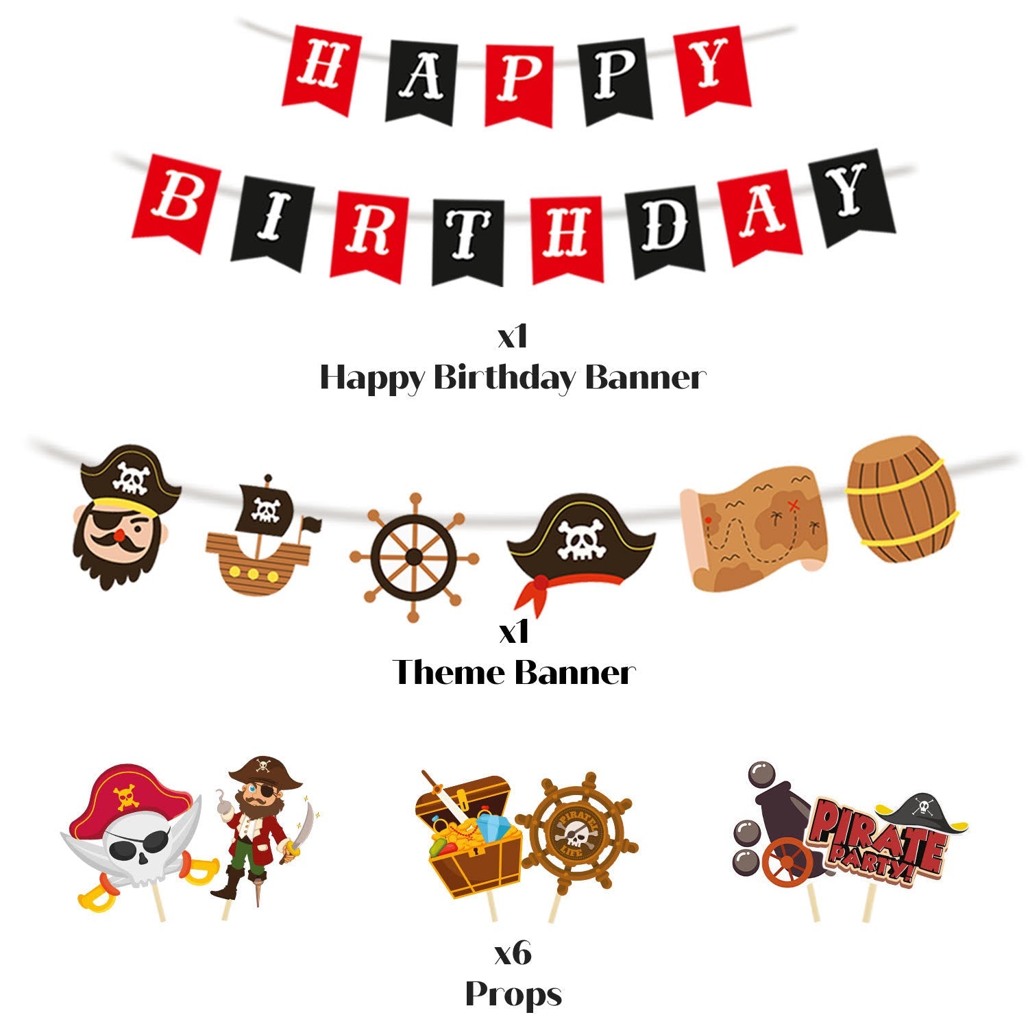 Our 100-piece Pirate Theme Birthday Decoration Kit is packed with everything to bring the pirate life to your party. From balloons to photo props, we’ve got it all covered. Here’s what’s inside: