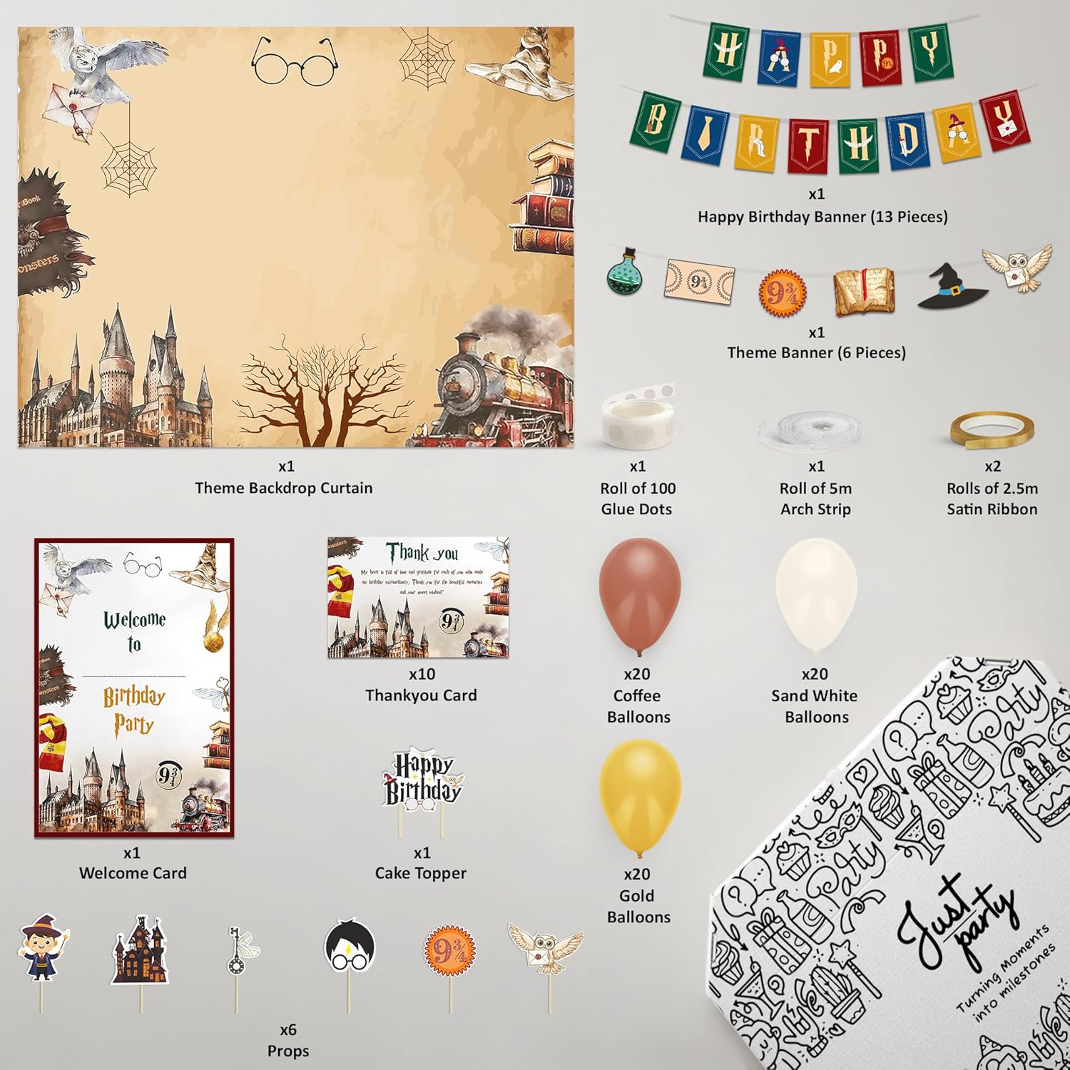 Our 100-piece Magical Boy & Wizarding World Birthday Decoration Kit is packed with everything to bring the magical world to life. From mystical balloons to spell-casting photo props, we’ve got it all covered. Here’s what’s inside: